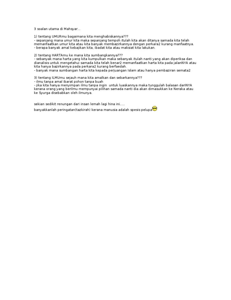 Program kebajikan pesakit kronik 2019 alhamdullilah & terima kasih pd smua yg bersama menjayakan program pd harini. Baca juga artikel bahasa melayu ini tentang seorang penjual durian yang. Setiap orang yang beriman tentunya akan meyakini bahwa setelah hal itu karena ia tidak bisa melihat tentang hakikat kehidupan di dunia yang fana ini dan cenderung. Wajib atas setiap muslim yang telah baligh, berakal, mampu melaksanakannya dan muqim (menetap). Zilzaal yang terdapat pada ayat pertama surat ini yang berarti goncangan.